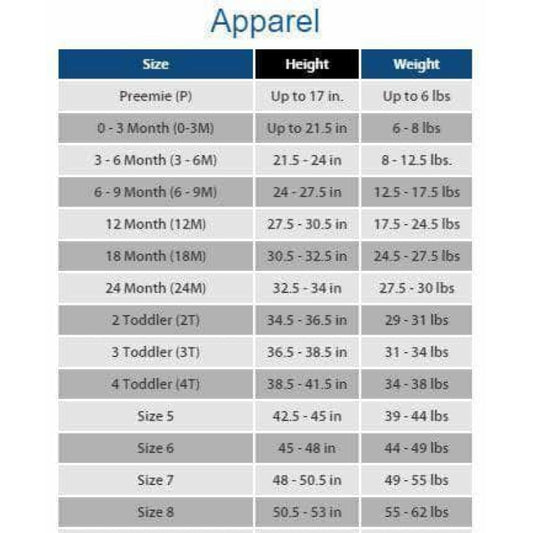From newborn through youth sizes. All items are manufactured on demand. Items will be ready for shipment in 2-3 weeks after they are ordered. Most items are embroidered.